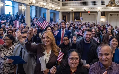 New U.S. citizens take part in a naturalization ceremony at Faneuil Hall in Boston on Jan. 8. Joseph Prezioso/AFP via Getty Images hide caption...